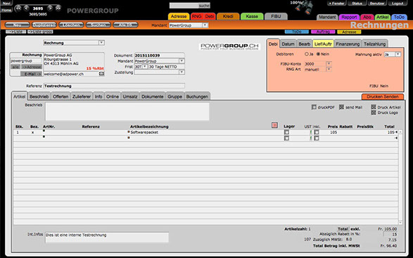 Sämtliche vordefinierten Daten werden vom Mandanten und den Adressen übernommen. So können individuelle Rechnungen innert 30 Sekunden erstellt und gedruckt werden.